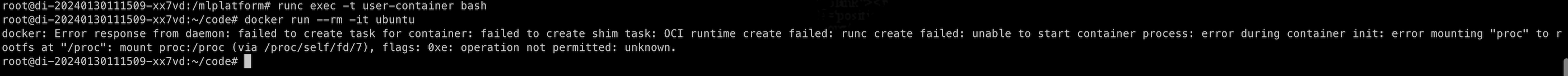 从报错信息flags: 0xe: operation not permitted可以知道这个问题的直接原因是挂载 proc文件系统的时候没有权限,导致这一现象的根本原因还需要进一步定位。