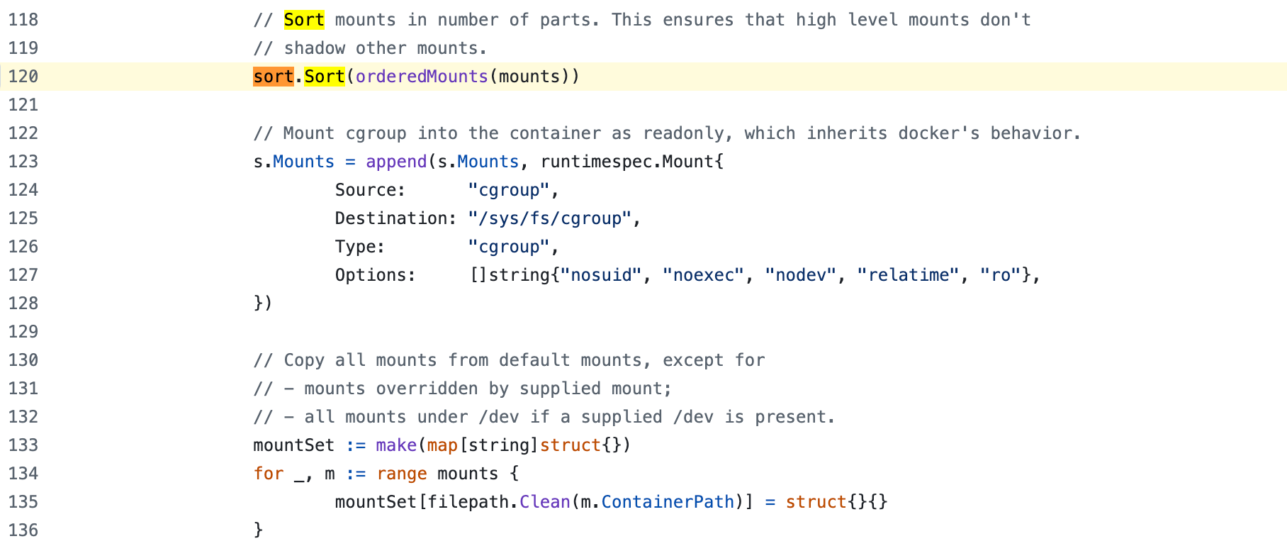 Containerd 老版本使用 Golang 1.18 编译,新版本使用 golang 1.20 编译,Golang 1.19 在 commit 72e77a7f41bbf45d466119444307fd3ae996e257[5] 将 sort.Sort 由稳定排序修改为不稳定排序。containerd 使用 sort.Sort 对挂载点进行排序,sort.Sort变为不稳定之后,containerd 传给 runc 的挂载点顺序发生了变化。