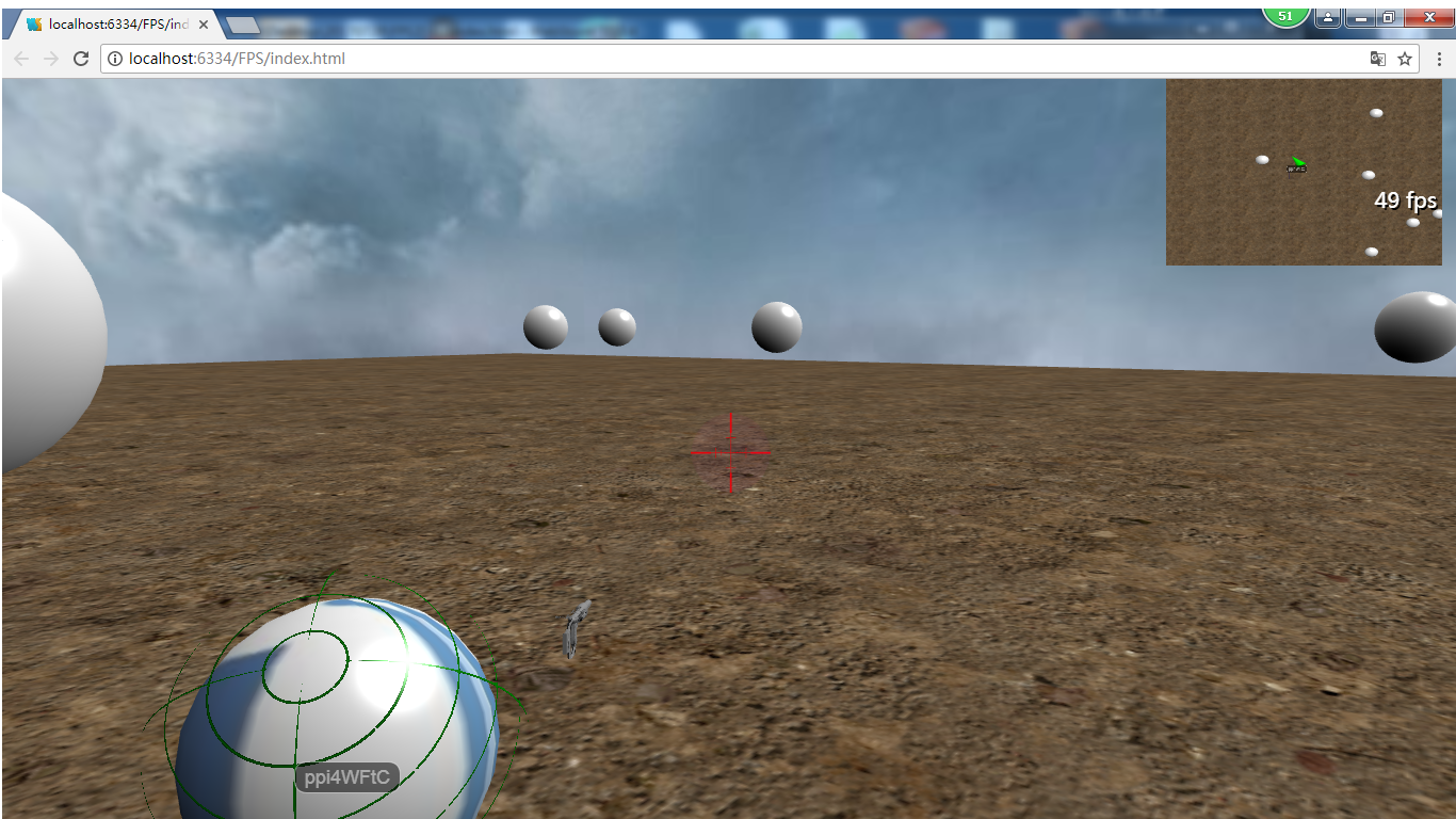 场景环境由一个天空盒和一个地面网格组成,屏幕中央是准星,左下部带有纹理的球体代表玩家模型,玩家模型外的绿网是玩家模型的物理仿真器,玩家模型的背部的随机字符表示玩家id,玩家模型的右前方是一个枪械模型,每隔一段时间场景中刷新一个球体网格代表射击目标,场景的右上角是一个以玩家为中心的小地图。