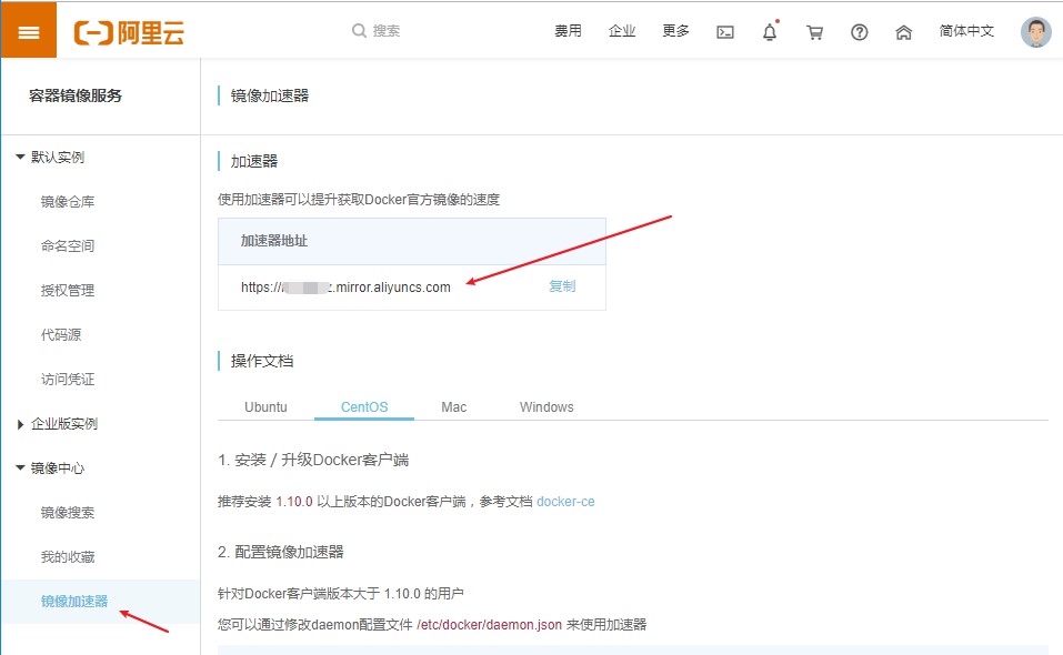 [root@web1 ~]# vim /usr/lib/systemd/system/docker.service [Unit] Description=Docker Application Container Engine Documentation=http://docs.docker.com After=network.target Wants=docker-storage-setup.service Requires=docker-cleanup.timer [Service] Type=notify NotifyAccess=main EnvironmentFile=-/run/containers/registries.conf EnvironmentFile=-/etc/sysconfig/docker EnvironmentFile=-/etc/sysconfig/docker-storage EnvironmentFile=-/etc/sysconfig/docker-network Environment=GOTRACEBACK=crash Environment=DOCKER_HTTP_HOST_COMPAT=1 Environment=PATH=/usr/libexec/docker:/usr/bin:/usr/sbin ExecStart=/usr/bin/dockerd-current --registry-mirror=https://rfcod7oz.mirror.aliyuncs.com \ #这个值可以登陆阿里云账号请参考下图 --add-runtime docker-runc=/usr/libexec/docker/docker-runc-current \ --default-runtime=docker-runc \ --exec-opt native.cgroupdriver=systemd \ --userland-proxy-path=/usr/libexec/docker/docker-proxy-current \ --init-path=/usr/libexec/docker/docker-init-current \ --seccomp-profile=/etc/docker/seccomp.json \ $OPTIONS \ $DOCKER_STORAGE_OPTIONS \ $DOCKER_NETWORK_OPTIONS \ $ADD_REGISTRY \ $BLOCK_REGISTRY \ $INSECURE_REGISTRY \ $REGISTRIES ExecReload=/bin/kill -s HUP $MAINPID LimitNOFILE=1048576 LimitNPROC=1048576 LimitCORE=infinity TimeoutStartSec=0 Restart=on-abnormal KillMode=process [Install] WantedBy=multi-user.target