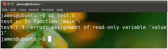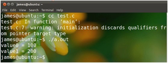 由于定义的指针变量p和表达式&value1的类型不匹配(p是int *,而&value1的类型是const int *)所以在第7行赋值的时候编译器会产生一个类型不匹配的警告,我们忽略该警告继续运行,结果改变了value1的值。