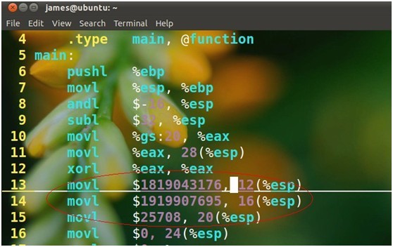 编译器会将该字符串按照四字节为一组转换成对应的32位整数来为该数组进行初始化,如图1-7所示,其中第13行的10进制整数1819043176转换成16进制为0x6c6c6568,正好是字符‘l’,’l’,’e’,’h’: