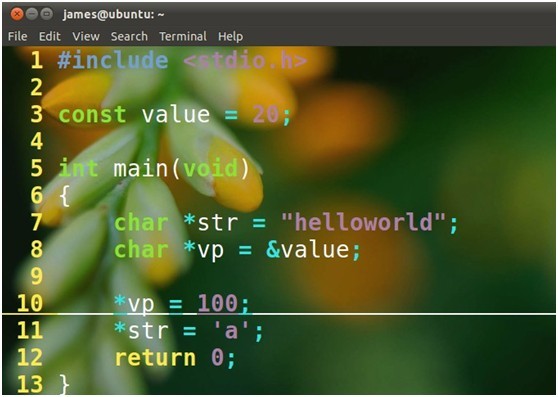 但是并不是所有被const修饰过的变量都放在常量区,事实上只有全局变量才是如此,普通的局部变量被const修饰后仅仅意味着在表达式上不能显式地改变该变量值,否则编译器会报语法错误,但该变量仍存放在栈区。而由于其存储区域没有发生本质的改变,因此仍然可以通过其他方式改变其值,比如指针。如图1-13所示: