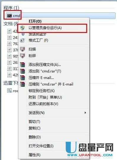 单击开始菜单,然后输入cmd,在最上方的备选程序图标上右击,选择“以管理员身份运行”。