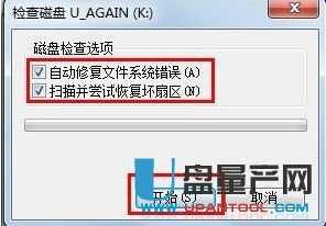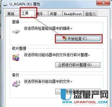 硬盘分区上右击,选择“属性”,单击“工具”选项卡后,单击“开始检查”。