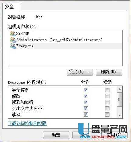 在“组合或用户名”中选中“Everyone”(即变蓝),在下方“Everyone 的权限”中勾选“完全控制”右侧“允许”下方的方框,点击“确定”,再点击“确定”。再尝试双击打开移动硬盘,ok 了!