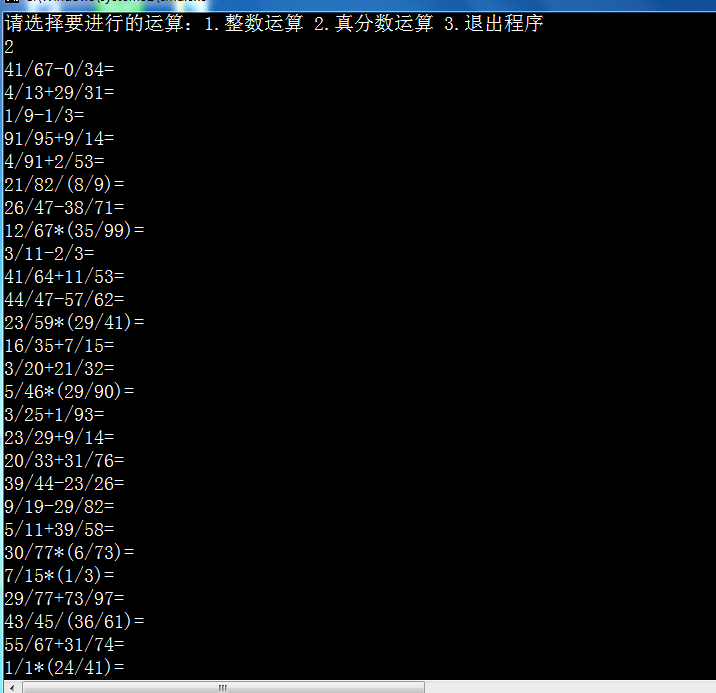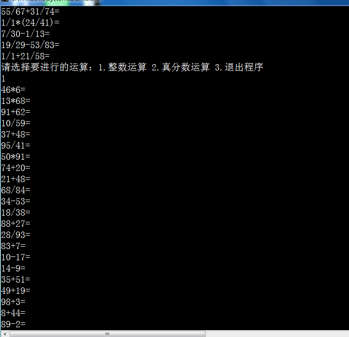 3)真分数运算部分,进行30次循环,每次循环先产生四个随机数,用来表示分子,分母。然后为了结果为真分数,要将分子分母比较大小,然后将分子变为较小的数。然后保证分母不为零,分母为零则加1.然后进行约分,保证为最简分数。最后将结果显示出来。