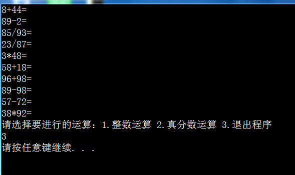 q:cout<<"请选择要进行的运算:1.整数运算 2.真分数运算 3.退出程序"<<endl;