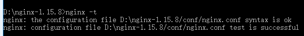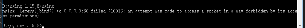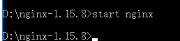 第三步:进入window的cmd窗口,输入如下图所示的命令,进入到nginx目录(D:\nginx-1.15.8),使用“start nginx.exe ”进行nginx的启动,如下图所示: