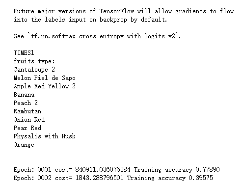 pred=conv_net(x,Weights,bias,keep_prob) cost=tf.reduce_mean(tf.nn.softmax_cross_entropy_with_logits(logits=pred,labels=y)) tf.summary.histogram('loss', cost) optimizer=tf.train.AdamOptimizer(0.01).minimize(cost) correct_pred=tf.equal(tf.argmax(pred,1),tf.argmax(y,1)) accuracy=tf.reduce_mean(tf.cast(correct_pred,tf.float32)) merged=tf.summary.merge_all() def train_and_test(train_x, train_y, test_x, test_y, epochs, batch_size, times = 1) : # 初始化全局变量 init=tf.global_variables_initializer() start_time = time.time() with tf.Session() as sess: sess.run(init) # 把需要可视化的参数写入可视化文件 writer=tf.summary.FileWriter('F:\\data\\fruits-360\\tensorboard\\Fruit_graph' + str(times), sess.graph) for i in range(epochs): batch_num = int(np.array(train_x).shape[0]/batch_size) sum_cost = 0 sum_acc = 0 for j in range(batch_num): batch_x = get_data(train_x, batch_size, j) batch_y = get_data(train_y, batch_size, j) sess.run(optimizer, feed_dict={x:batch_x,y:batch_y,keep_prob:0.75}) loss,acc = sess.run([cost,accuracy],feed_dict={x:batch_x,y:batch_y,keep_prob: 1.}) sum_cost += loss sum_acc += acc result=sess.run(merged,feed_dict={x:batch_x, y:batch_y, keep_prob:0.75}) writer.add_summary(result, i) arg_cost = sum_cost/batch_num arg_acc = sum_acc/batch_num print("Epoch:", '%04d' % (i+1),"cost=", "{:.9f}".format(arg_cost),"Training accuracy","{:.5f}".format(arg_acc)) end_time = time.time() print('Optimization Completed') print('Testing Accuracy:',sess.run(accuracy,feed_dict={x:test_x, y:test_y,keep_prob: 1})) print('Total processing time:',end_time - start_time) for i in range(10): random_fruits = get_random_fruits(Training, n_classes) img_data, img_label, num_label = load(Training, random_fruits) crop_img = crop(img_data) test_data, test_label, test_num_label = load(Test, random_fruits) crop_test = crop(test_data) print("TIMES"+str(i+1)) fruits_type(random_fruits) print("\n") train_and_test(crop_img, num_label, crop_test, test_num_label, 20, 26, (i+1)) print("\n\n\n")