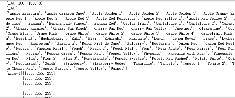 #获取随机抽取的10类水果的图像 def load(root, random_fruits): #存放图像 image_data = [] #存放标签 image_label = [] #存放图像标签码 num_label = [] #遍历水果类型 for i in range(len(random_fruits)): #第一层子目录(水果种类) child1 = os.listdir(root)[i] #第二层子目录(水果图像) child2 = os.listdir(os.path.join(root, child1)) #对第二层目录进行自然数排序,os.listder默认为str排序 child2 = natsorted(child2) #遍历水果图像 for j in range(len(child2)): #结合第一二层子目录 path = os.path.join(root, child1, child2[j]) #只读取'.jpg'文件(文件后缀是否为'.jpg') if(path.endswith('.jpg')): #把文件读取为图像存入image_data image_data.append(skimage.data.imread(path)) #储存第一层子目录文件名(即水果名) image_label.append(child1) #把第一层子目录文件名的下标作为水果类型的编码 num_label.append(i) #把水果类型编码转换为one_hot编码 num_label = keras.utils.to_categorical(num_label, len(random_fruits)) #print("图片数:{0}, 标签数:{1}".format(len(image_data), len(os.listdir(root))) #输出图片和标签数 return image_data, image_label, num_label
