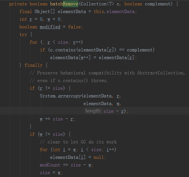 removeAll会直接调用此方法,传入list和false,因中间的逻辑都不会走(如果由retainAll方法调用,则会走这些逻辑判断),所以只需要看finaly中的最后一个if条件,w=0,通过循环将数组中的值全部变为null,同时将数组的长度也设置为0