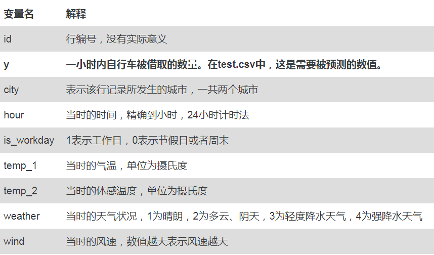 公共自行车低碳,环保,健康,并且解决了交通中“最后一公里”的痛点,在全国各个城市越来越受欢迎。本次练习的数据取自于两个城市某街道上的几处公共自行车停车桩。我们希望根据时间,天气等信息,预测出该街区在一小时内的被借取的公共自行车的数量。