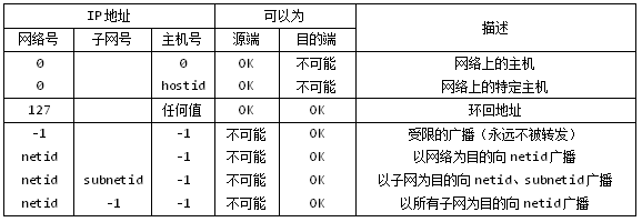 说明:0表示所有bit全为0;-1表示所有bit全为1;netid、subnetid和hostid分别表示不为全0或全1的对应字段。子网号栏为空表示该地址没有进行子网划分