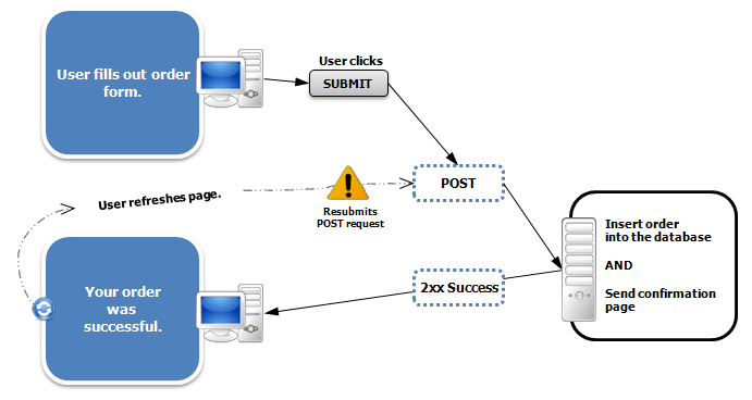 当一个表单通过HTTP POST被请求提交的时候,用户在服务器端返回响应期间如果刷新了响应页面,将会导致原始HTTP POST过来的内容重复提交,可能会导致一些不可预期的结果,比如重复提交数据