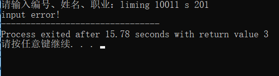 解决办法: scanf("%d%s%s",&person[i].number,&person[i].name,&person[i].job);改为scanf("%s%d%s",&person[i].name,&person[i].number,&person[i].job);因为我输入的顺序和字符类型不同。