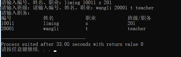#include<stdio.h> #include<stdlib.h> struct { int number; char name[30]; char job; union { int classes; char position[10]; }category; }person[2]; main() { int i; for(i=0;i<2;i++) { printf("请输入编号、姓名、职业:"); scanf("%s%d%s",&person[i].name,&person[i].number,&person[i].job); if(person[i].job=='s') { printf("请输入班级:"); scanf("%d",&person[i].category.classes); } else if(person[i].job=='t') { printf("请输入职务:"); scanf("%s",&person[i].category.position); } else { printf("input error!"); abort(); } } printf("\n"); printf("编号\t\t姓名\t\t职业\t\t班级/职务\n"); for(i=0;i<2;i++) { if(person[i].job=='s') { printf("%d\t\t%s\t\t%c\t\t%d\n",person[i].number,person[i].name,person[i].job,person[i].category.classes); } else { printf("%d\t\t%s\t\t%c\t\t%s\n",person[i].number,person[i].name,person[i].job,person[i].category.position); } } }