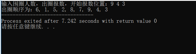 #include<stdio.h> #define N 10 struct child { int no; int next; }; struct child link[N]; main() { int i,n,m,s,count,h; printf("输入围圈人数,出圈报数,开始报数位置:"); scanf("%d%d%d",&n,&m,&s); for(i=1;i<=n;i++) { if(i==n) link[i].next=1; else link[i].next=i+1; link[i].no=i; } count=0; if(s==1)h=n;else h=s-1; printf("出圈顺序为:"); while(count<n-1) { i=0; while(i!=m) { h=link[h].next; if(link[h].no) i++; } printf("%d, ",link[h].no); link[h].no=0; count++; } for(i=1;i<=n;i++) { if(link[i].no!=0) printf("%d",link[i].no); } }
