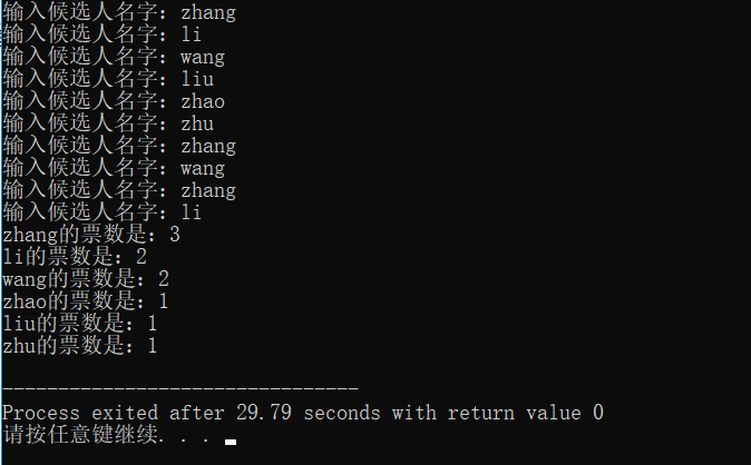 #include<stdio.h> #include<string.h> struct person { char name[20]; int count ; }a[6]={"zhang",0,"li",0,"wang",0,"zhao",0,"liu",0,"zhu",0}; main() { int i,j; char abc[20]; for(i=1;i<=10;i++) { printf("输入候选人名字:"); scanf("%s",abc) ; for(j=0;j<6;j++) if(strcmp(abc,a[j].name)==0) a[j].count++; } for(j=0;j<6;j++) printf("%s的票数是:%d\n",a[j].name,a[j].count); }