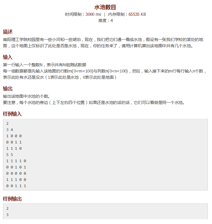 这道题有点坑,也怪我总是有点马虎,按照正常人的思维0是表示有水池啊竟然是1表示有水池,最坑的是写反了竟然还能过样例一直以为是自己程序问题review了好多遍....![]()