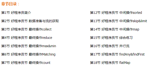 本课程全方面的介绍对集合流式操作,数据准备,collect方法的使用,reduce方法的使用,max和min方法的使用,matching匹配操作,count方法使用,forEach方法的使用等。