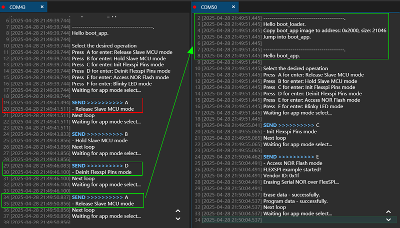 现在给板卡供电,将包含 boot_app 的 boot_loader 程序下载进 Flash,主板串口是 COM43,从板串口是 COM50,我们做一个快速测试,给主板直接发送 A 指令发现从板没有启动,但是执行过 D 指令后再发送 A 指令,这时候从板就正常启动了。此外主/从板也都能对 Flash 进行正常擦写,这证明我们的创新连接方法是切实可行的。