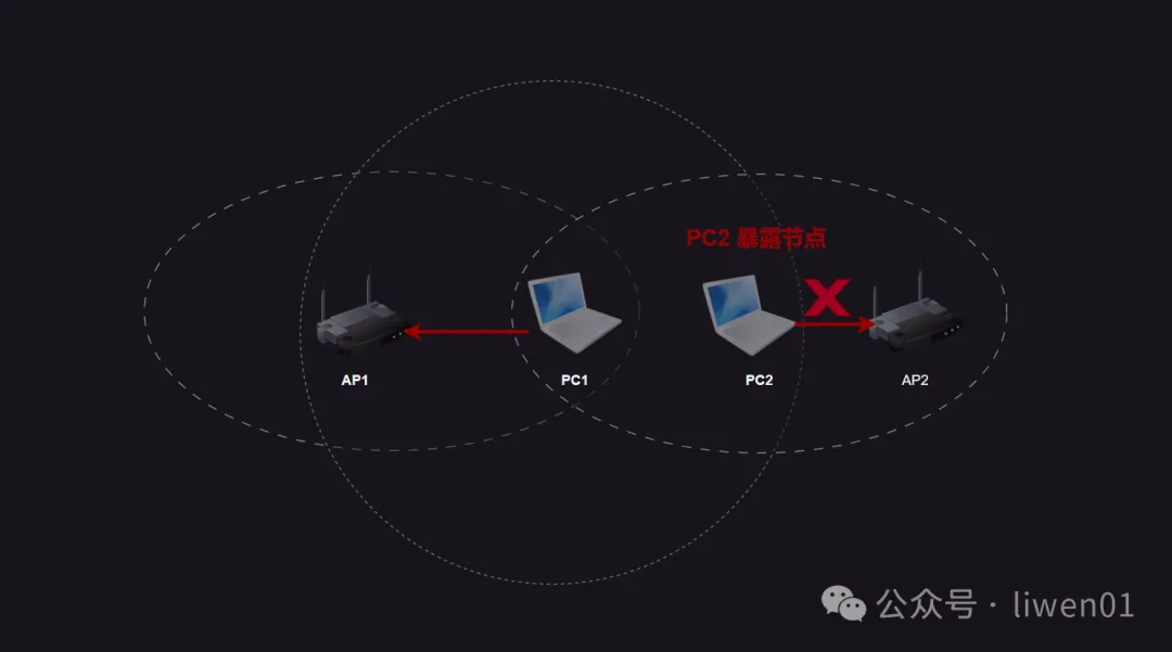 根据 CSMA/CA 协议,PC2 侦听信道,它将听到 PC1 正在发送数据,于是错误地认为它此时不能向 AP2 发送数据,但实际上它的发送不会影响 AP1 的数据接收,这就导致 PC2 所谓暴露节点问题的出现。