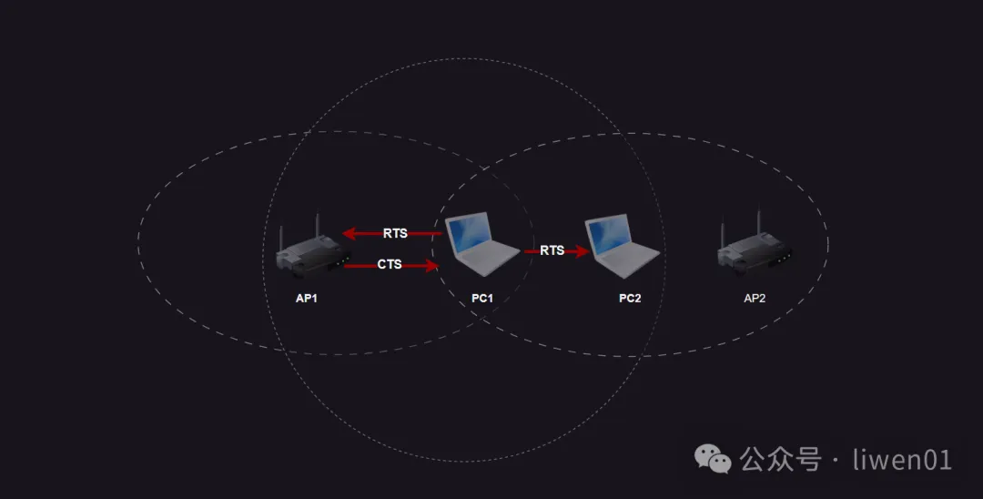 - PC1 要发送数据,于是发送 RTS 帧,AP1 和 PC2 都可以接收到该 RTS帧