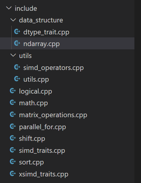 这是项目的结构,logical部分包含了位运算的实现代码,math部分包含了数学函数的实现,shift部分包含了位移的部分,matrix_operations部分包含了矩阵算法的部分,sort是排序部分,parallel_for是向量化for循环的部分。而simd_traits.cpp和xsimd_traits.cpp则负责编译期萃取类型,因为SIMD函数有很多类型,我将它封装成了一个结构体,里面各类型的函数都封装成一个统一接口,这样就能减少很多重复代码。