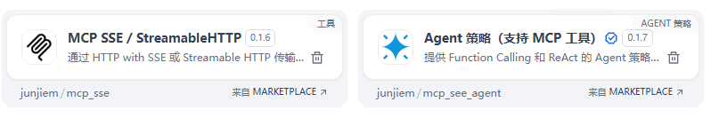 需要安装2个插件,分别是:Agent 策略(支持 MCP 工具),MCP SSE