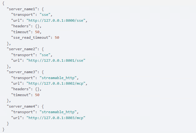 { "mysql8-mcp-server": { "transport": "streamable_http", "url": "http://172.16.3.121:9000/mcp/", "timeout": 60 } }