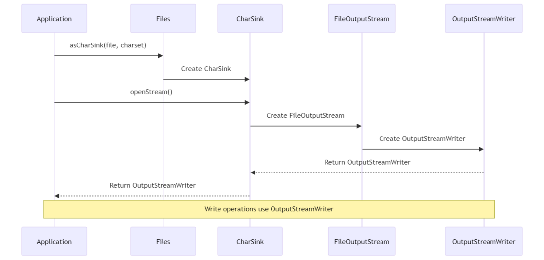 这里Files.asCharSink创建了一个CharSink实例,它代表文件的写入点。charSink.writeLines方法可以轻松地将一个字符串列表写入文件。