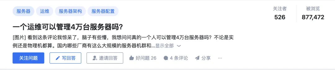 运维总监让我管理 4 万台服务器,这可能吗? 今天看到这样一个问题:"一个运维可以管理4万台服务器吗?"问题地址:https://www.zhihu.com/question/386653243背景介绍看到这条评论我惊呆了,脑子有些懵,我想问问真的一个人可以管理4万台服务器吗?不论是实例还是物理机都算。国内哪些厂商有这么大规模的服务器机群和集群?大厂商真的是一个人可...