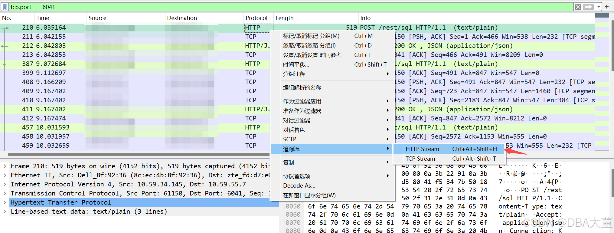最新Wireshark查看包中gzip内容 虽然是很简单的事情,但是网上查到的查看gzip内容的方法基本都是保存成zip文件,然后进行二进制处理。其实现在最新版本的Wireshark已经支持获取gzip内容了。选中HTTP协议,右键选择[追踪流]->[HTTP Stream]在弹出窗口中,已经可以看到gzip中内容被提取出来了。TIPS在非常规通信端口通信时,...