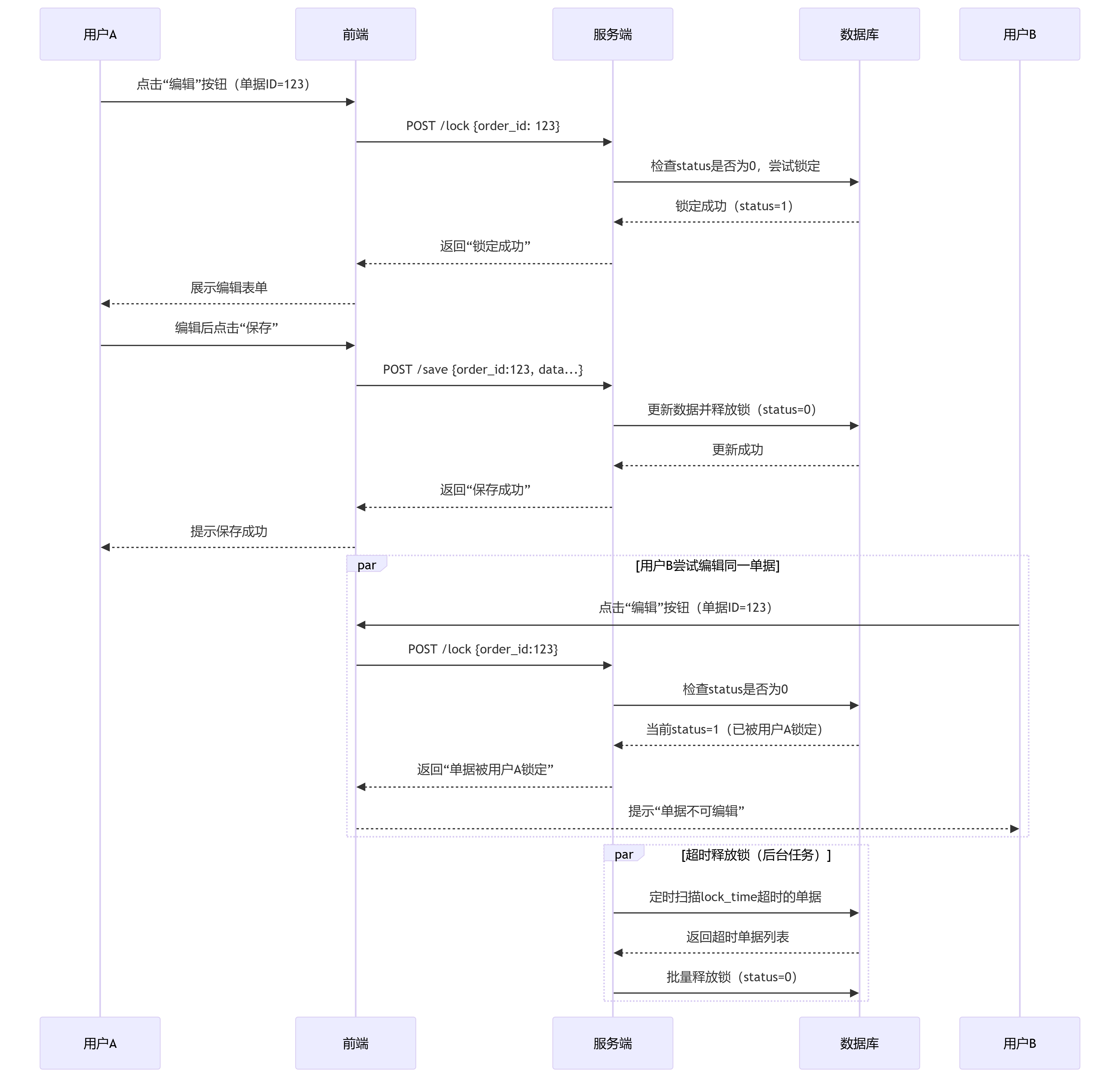 | 3 | 用户A提交保存 | 发送保存请求,携带修改数据 | 更新单据数据,并释放锁(status=0) | UPDATE table SET ..., status=0 WHERE id=123 AND lock_by='A' |