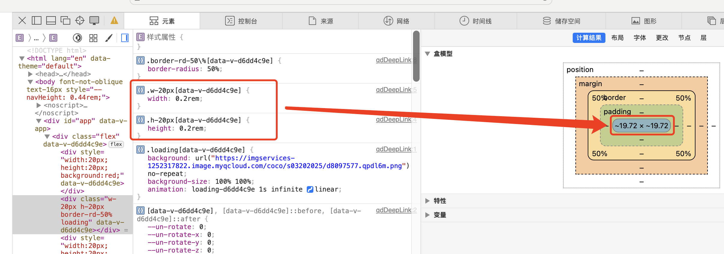 可以看到0.2rem计算过后的值为19.72px,这样就出现了亚像素,但是它宽高依然还是相等的,旋转起来也不应该出现抖动的现象🤔
