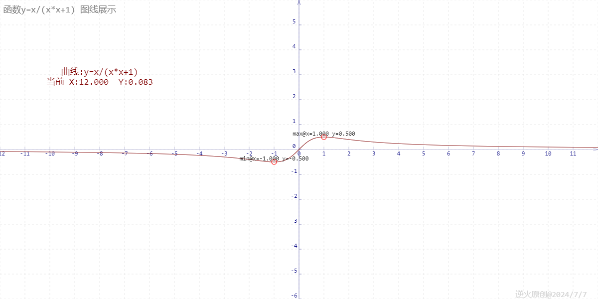 【高中数学/基本不等式】当x是正实数时,求函数f(x)=x/(1+x^2)的最大值? 【问题】当x是正实数时,求函数f(x)=x/(1+x^2)的最大值?【解答】解:f(x)=x/(1+x^2)=1/(x+1/x))<=1/2倍根号下(x*1/x)=1/2所以函数在[0,+∞)的区域最大值为0.5【函数图像】f(x)=x/(1+x^2)是奇函数,没有断点,是可以一笔从头画到尾的。由图可见,在x正轴上,...