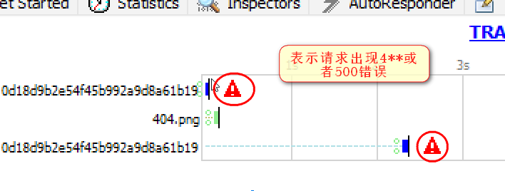 条形栏后面的红色 X 图标表示服务器发送了请求头 Connection: close(对于 HTTP/1.0 类型的响应,是指发送请求头Connection: Keep-Alive 失败),阻止后续请求重用该连接。灰色箭头图标表示服务器响应是重定向的(302)。红色感叹号图标表示服务器返回了错误码(4xx 或 5xx)。如下图: