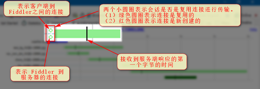 条形栏中黑色的垂直线表示接收到服务端响应(Timers.ServerBeginResponse)的第一个字节的时间。条形栏前面的两个小圆圈表示会话是否是复用连接进行传输。绿色圆圈表示连接是复用的,而红色圆圈表示连接是新创建的。上方的圆圈表示客户端到Fiddler之间的连接;下方的圆圈表示 Fiddler 到服务器的连接。如下图:
