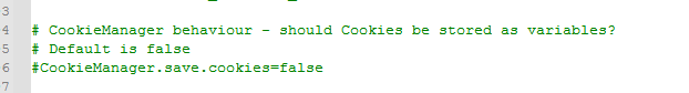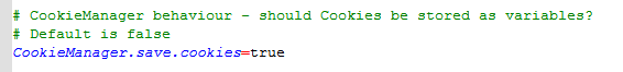要将Cookie存储为变量,首先需要先将/bin目录下jmeter.properties文件的“#CookieManager.save.cookies=false”修改为“CookieManager.save.cookies=true”且去掉注释“#”。