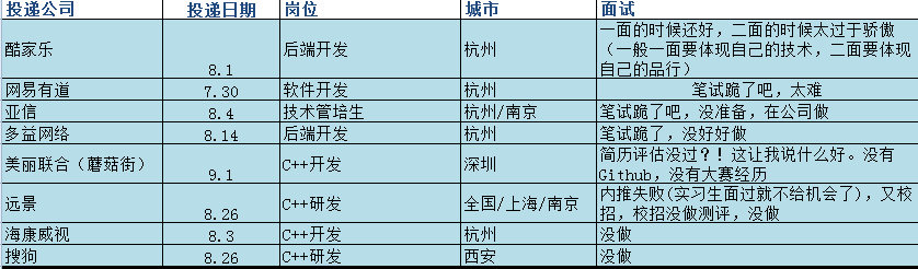 九月感觉每天不是在投简历,就是在做笔试,不是在做笔试,就是去面试,总之非常忙碌的一个月。以下是所有投递的公司:
