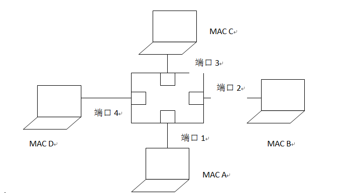 假设MAC A, MAC B, MAC C, MAC D四台主机接在交换机的1,2,3,4端口上