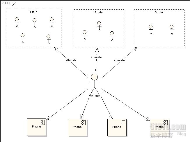 上图中对于使用电话的用户又作了一次分类,1min的代表这些使用者占用电话时间小于等于1min,2min表示使用者占用电话时间小于等于2min,以此类推。根据电话使用规则,1min的用户只需要得到一次分配即可完成通话,而其他两类用户需要排队两次到三次。