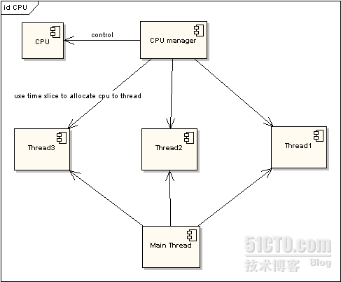 在图一中可以看到,任何线程如果都排队等待CPU资源的获取,那么所谓的多线程就没有任何实际意义。图二中的CPU Manager只是我虚拟的一个角色,由它来分配和管理CPU的使用状况,此时多线程将会在运行过程中都有机会得到CPU资源,也真正实现了在单CPU的情况下实现多线程并行处理。