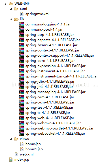 注:此处,如果,只有spring的包,而没有”commons-pool-1.4.jar“和”commons-logging-1.1.1.jar“(版本不限),会在启动tomcat的时候,出现,找不到日志类Not found class Log,或者线程池错误Thread pool。
