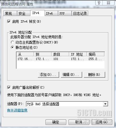 右击路由和远程访问-属性-IPv4-静态地址池(用于指定客户机拨入×××后,分配的IP范围,我指定IP是:172.16.2.100-200)