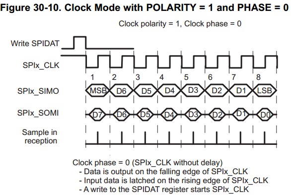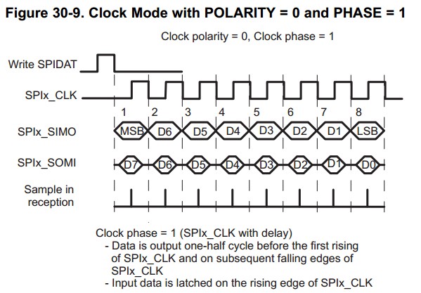 时钟极性和相位都是1时,上升沿为后沿,数据稳定被采样(锁存),下降沿为前沿,被写入SPI总线.