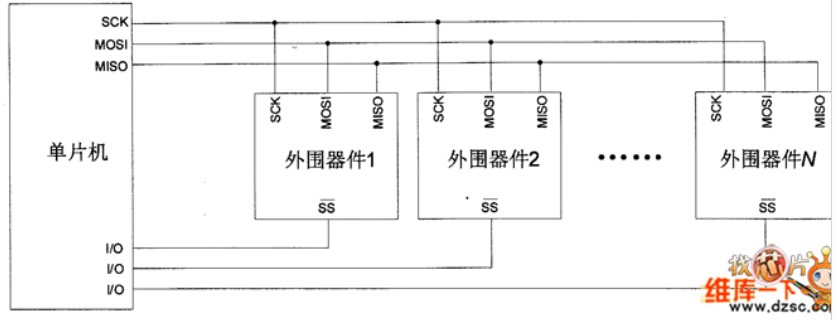 下图是一个主机和多个从器件的通信系统.各个从器件是单片机的外围扩展芯片,它们的片选端SS分别独占单片机的一条通用I/O引脚,由单片机分时选通它们建立通信.这样省去了单片机在通信线路上发送地址码的麻烦,但是占用了单片机的引脚资源.当外设器件只有一个时,可以不必选通而直接将SS端接地即可.