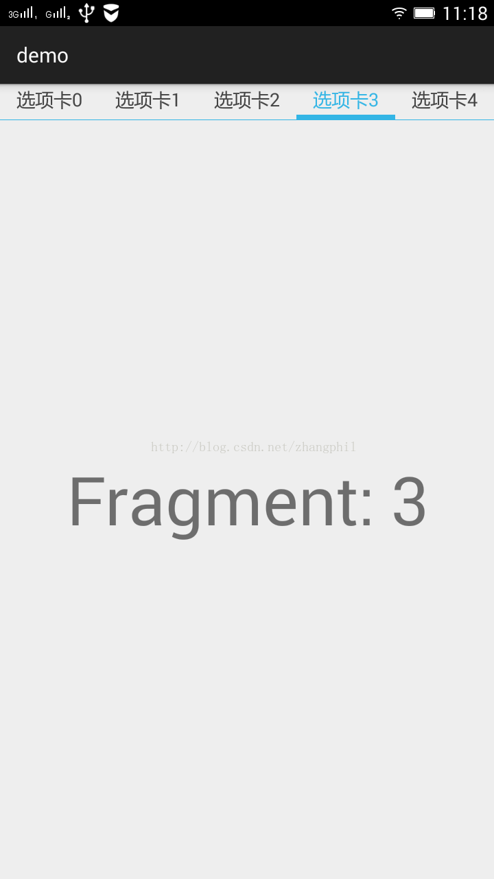 * 控件效果图如图所示。 这里面有一个特别的效果是:头部的选项卡在ViewPager切换过程中,底部的滑块也随之动态渐渐滑动过渡。