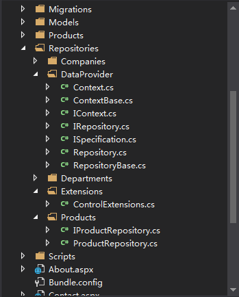 DataProvider文件夹下就是实现Repistory设计模式的产生的类库文件,包括CRUD方法和一个Context工厂类模型